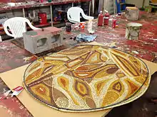 Aboriginal fibre works until the later decades of the 20th century were almost universally regarded and marketed as ethnographic or craft items.[5] However various factors, beginning around the 1970s, began to see fibre works enter the fine art market. First among these was the Australian government support for Aboriginal art centres, which increased from around the 1970s.[6] This provided more marketing, feedback and art world exposure to practitioners, which encouraged them to create innovative and ambitious products and exhibit their traditional works in new contexts.[7] Parallel to this, a number of exhibitions and awards began to exhibit fibre works in a fine art context, which helped change public and collector perceptions. These included the exhibitions Maningrida: The Language of Weaving (1989), Spinifex Runner (1999) and Twined Together (2005), as well as awards such as the National Aboriginal & Torres Strait Islander Art Award (NATSIAA).[8] Major galleries such as the Museum of Contemporary Art in Sydney and the Queensland Art Gallery in Brisbane also began to exhibit fibre works within their collections as fine art.[9]