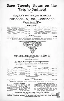 The company operated a regular passenger and airmail service between Brisbane, Sydney and Melbourne that was in January 1931 extended to Launceston and Hobart in Tasmania.[3] Unable to obtain a formal mail subsidy, the deepening Great Depression saw revenues fall, a situation that worsened after the crash of VH-UMF Southern Cloud in the Australian Alps between Sydney and Melbourne on 21 March 1931. ANA ceased scheduled services at the end of June 1931,[4] although it continued to operate joy flights mostly around New South Wales,[5] and offered pilot training services with a fleet of small aircraft.[6]