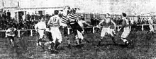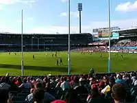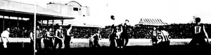 The first Victorian Football League match played in Sydney was with Fitzroy Football Club 7–10, defeating the Collingwood Football Club 6–9 at the Sydney Cricket Ground on 24 May 1903.[26] The large attendance of 20,000 saw the exhibition hailed as a success and inspired the league to continue scheduling more matches in Sydney. However, follow-up matches quickly began to attract cynicism from the Sydney football public, as a VFL push when Geelong Football Club 8.7 (55) defeated Carlton Football Club 6.9 (45) at the SCG a few months later. The matches were seen by the Sydney media as an attempt to force-feed the Victorian game to Sydneysiders who had plenty of rugby to attract their ongoing interest. The crowd of 5,000 was much smaller than those of rugby games in the city.[27] In 1904, Melbourne Football Club 9–17 (71) defeated Essendon Football Club 6–3 (39) in front of 6,000 people.[28] Without any interest, top-level VFL disappeared from Sydney for decades.