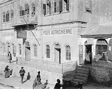 Austria gained permission in 1721 from the Ottoman Empire to operate a postal service for official correspondence only and subsequently this was extended to the opening of post offices and carrying mail for merchants.[1] This resulted in 1748 with the establishment of a post office in Galata outside of Istanbul, and eventually extended to 65 locations[2] throughout the Balkans and the eastern Mediterranean. The oldest known cancellation is a double linear "CONSTAN-TINOPEL" in 1787.[3] The latest remaining Austrian post offices in Turkey area were closed on 30 September 1914.[4]