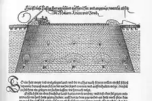 It is noticeable that the Italian style of military architecture did not extend to Upper Austria and apart from Vienna was only employed in a very limited way in Lower Austria. Merian shows that ravelins were added to the corners of the defences of Krems, and the Merian ground plan of Korneuburg shows angle bastions added to the medieval defences. A massive trace bastion was added to the northwest corner of the Obere Stadt at Klosterneuburg, probably as part of a more extensive scheme. This scheme presumably was not required after the withdrawal of the Turks following the siege of Klosterneuburg in 1683 (which took place at the same time as the siege of Vienna).[35] The Prince-Archbishops of Salzburg were slow to adopt the new Italian fashion. At Radstadt their response to the Turkish threat was to use more conventional strengthening of the fortifications, but at Salzburg between 1620 and 1646, the Archbishop Paris von Lodron, under the threat of the Thirty Years' War and the Swedes under Tortennson, commissioned Santino Solari, a Swiss/Italian from Ticino, to expand the defences of Salzburg. In particular four massive trace bastions with ravelins were built around the Mirabell Palace. In 1646 Solari started work at Neumarkt am Wallersee for the Archbishop, but his scheme was probably not completed.[36]