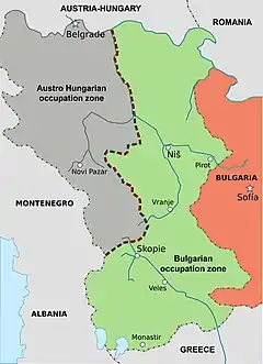 According to the terms of the secret alliance between Bulgaria and Germany, the greater part of Kosovo, including the areas of Priština, Prizren, Gnjilane, Uroševac, and Orahovac, were to fall under Bulgarian rule as part of the Military Region of Macedonia.[70] Metohija, the southwestern area of Kosovo, was to be incorporated as part of the Austro-Hungarian zone of Montenegro, with the rest of Kosovo, including Kosovska Mitrovica, Vučitrn, and Đakovica, established as part of the Austro-Hungarian Military Governorate of Serbia.[71]