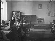 Serbian schoolchildren in Loznica learning Latin characters after the Cyrillic script was banned by the Austro-Hungarian authorities. A portrait of Emperor Franz Joseph can be seen on the wall.