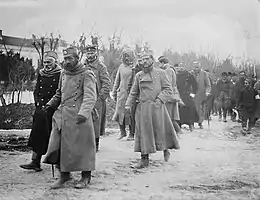In early February 1917, a rebellion led by Vojinović broke out in the vicinity of Kuršumlija and Prokuplje. The insurgents, supported by volunteers and Chetniks from Montenegro, liberated Kuršumlija, Prokuplje, Pusta Reka, Lebane and Ribarska. The uprising was planned to coincide with an Allied offensive.[106] Later that month, a large scale uprising broke out in the Toplica District in Bulgarian-occupied Serbia. A force of 4,000 armed men and women managed to liberate a significant area in the Morava Valley before the uprising was put down.[39] During the summer of 1917, the Austro-Hungarian Army was forced to bring in troops from the Isonzo Front to reinforce the Bulgarian Army and Bulgarian paramilitary groups.[107] Without the expected Allied support, the uprising collapsed. In late 1917, Vojinović was killed; Pećanac managed to escape and went into hiding. According to contemporary Austro-Hungarian Army reports, 20,000 Serbs were killed in the course of the rebellion, while 2,600 managed to escape into the forests.[108] Despite the harsh repression, guerrilla groups managed to survive and were able to support Allied offensive operations in the summer of 1918.[109] After the war, Chief of Staff Paul Kirch described the withdrawal of the German 11th Army: