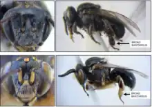 | Worker (top) and drone (bottom) of A. magna. The black arrows point at the characteristic broad basitarsus of the species. | |