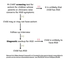 - ↑ Huerta M, Lord C (February 2012). "Diagnostic evaluation of autism spectrum disorders". Pediatric Clinics of North America. 59 (1): 103–11, xi. doi:10.1016/j.pcl.2011.10.018. PMC 3269006. PMID 22284796.