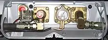 In most modern installations, an electronic device called a tachometric relay or safety switch is used to operate electrical shut-off solenoids. These work by sensing that the engine is running by detecting ignition pulses. Some systems use an engine oil pressure sensor instead. In all installations, there is a filterlock (consisting of a filter assembly and a vacuum or electric solenoid operated shut-off valve) located at the input to the converter. In European converters, there is also a solenoid in the converter to shut off the idle circuit. These valves are usually both connected to the output of the tachometric relay or oil pressure switch. Where solenoids are fitted to the outputs of fuel tanks, these are also connected to the output of the tachometric relay or oil pressure switch. In installations with multiple tanks, a switch or changeover relay may be fitted to allow the driver to select which tank to use fuel from. On bi-fuel, the switch used to change between fuels is used to turn off the tachometric relay.