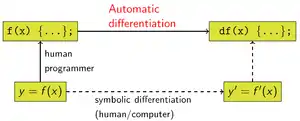 In mathematics and computer algebra, automatic differentiation (auto-differentiation, autodiff, or AD), also called algorithmic differentiation, computational differentiation,[1][2] is a set of techniques to evaluate the partial derivative of a function specified by a computer program.
