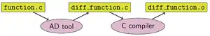 The source code for a function is replaced by an automatically generated source code that includes statements for calculating the derivatives interleaved with the original instructions.