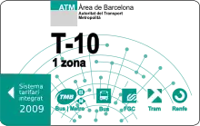 There are eight basic types of fare-integrated cards—the T-10, T-50/30, T-70/30, T-Mes, T-Jove, T-Trimestre, T-Dia and T-16—, all of which are multiple-time tickets or unlimited passes allowing free-of-charge interchange between transport modes in 1 hour and 25 minutes within one fare zone (plus 15 minutes for each additional zone). Single tickets are not fare-integrated and thus they do not allow interchange between transport modes or operating companies.[13] All fare-integrated cards are identified with letter T followed by a hyphen ("T-") before a distinct name. There currently exist about 80 types of fare-integrated cards, depending on the number of fare zones permitted to cross, their validity period as well as the existence of fare reductions.[6] Non-personalised fare-integrated cards can be purchased at railway and bus stations, at tram stops, at customer service points of the integrated companies, at CaixaBank cash machines, as well as at newsagent's shops and a number of small shops.[14]