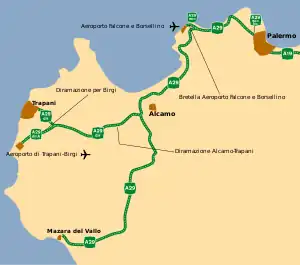 The Autostrada A29 is a 114.8 km (71.3 mi) motorway on the island of Sicily that links Palermo to Mazara del Vallo. The motorway is also called Autostrada del Sale (Motorway of Salt) because one of its branches ends at the Salt Pans between Marsala and Trapani. It's a four-lane motorway in its whole length.