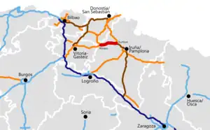 The Autovía A-10 (also known as Sakanako Autobia) is an autovía in Navarre.[1] It is 29 kilometres (18 mi) long and runs from the Autovía A-15 at Irurtzun to the Autovía A-1 at Altsasu. Built between 1992 and 1995 as an upgrade of the N-240 road, it received the A-10 designation in 2003 as part of the general renumbering of Spanish autovías.[2]