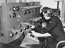 Corporal Jarratt, a WAAAF telegraphist operating Medium Frequency Direction/Finding (MFD/F) equipment at VAOC Headquarters at Victoria Barracks.
