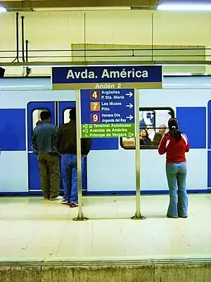 Avenida de América ([aβeˈniða ðe aˈmeɾika]; "Avenue of the Americas") is a multimodal station in Madrid, Spain that services Madrid Metro Line 4, Line 6, Line 7, and Line 9, as well as city buses and intercity and long-distance coaches. Between 1986 and 1996, it also served Line 8. The station is located below the intersections of Avenida de América and Francisco Silvela and Príncipe de Vergara streets. The station consists of several underground levels, with the bus terminal located in the upper three and the Metro station located in the lower four. It serves the neighborhood of Prosperidad and El Viso in Chamartín district and La Guindalera in Salamanca district. It is about 15 minutes from Madrid Barajas Airport and 10 minutes from the city centre of Madrid.[1][2][3][4]