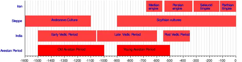 - Approximate timeline of the Avestan period (estimates according to Prods Oktor Skjaervo[35]) vis-a-vis several regions inhabited by Indo-Iranian peoples from 1500 BCE to 0 CE. The range for the Old Avestan period represents an uncertainty range rather than a duration, i.e., Zarathustra and his immediate followers may have lived sometime during the indicated time frame.