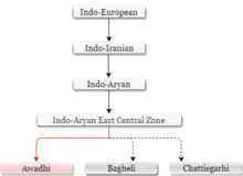 Awadhi is an Indo-European language and belongs to the Indo-Aryan sub-group of the Indo-Iranian language family. Within the Indo-Aryan dialect continuum, it falls under the East-Central zone of languages and is often recognised as Eastern-Hindi. It is generally believed that an older form of Ardhamagadhi, which agreed partly with Sauraseni and partly with Magadhi Prakrit, could be the basis of Awadhi.[19]