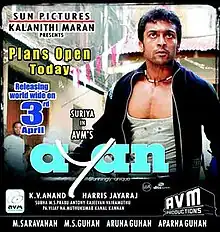 The film was launched in Chennai, while filming also took place in various locations out of India, including Namibia, Malaysia, Zanzibar and South Africa. It released on 3 April 2009 worldwide to positive reviews.[5][6] Ayan was declared as the solo blockbuster of 2009 in Tamil cinema,[7] collecting about ₹80 crore (US$10 million) worldwide.[3][8][9][10] The film was also successful in Kerala.[2]