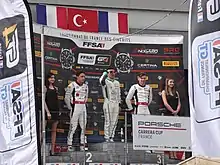 ![]() Ayhancan Güven (middle) on podium as the winner of the Porsche Carrera Cup France on the Circuit Paul Armagnac in Nogaro, Gers on 22 April 2019. | |