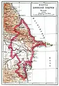 During the 19th century the Caucasus region was contested between the declining Ottoman Empire, Persia and Russia, which was expanding southwards.[2] By the Russo-Persian War (1804–1813) and the subsequent Treaty of Gulistan, Russia acquired the bulk of what is now Azerbaijan and parts of Armenia.[2][3][4] Russia organised the areas that now form Azerbaijan into the governorates of Baku and Elizavetpol (and the Zakatal Okrug within the Tiflis Governorate) – the northern border of these subdivisions effectively set the Azerbaijan–Russia border at its current location.