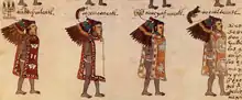 The Nahuatl words aztēcatl (Nahuatl pronunciation: [asˈteːkat͡ɬ], singular)[10] and aztēcah (Nahuatl pronunciation: [asˈteːkaʔ], plural)[10] mean "people from Aztlan",[11] a mythical place of origin for several ethnic groups in central Mexico. The term was not used as an endonym by Aztecs themselves, but it is found in the different migration accounts of the Mexica, where it describes the different tribes who left Aztlan together. In one account of the journey from Aztlan, Huitzilopochtli, the tutelary deity of the Mexica tribe, tells his followers on the journey that "now, no longer is your name Azteca, you are now Mexitin [Mexica]".[12]
