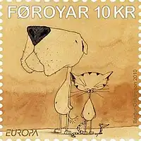 Faroese stamp from 2010 with motif from Oskarsson's book A dog, a cat and a mouse.