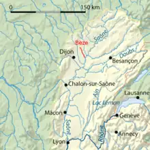 La Bèze flows through the center of the "Bèze-Albane" catchment basin in the heart of the Saône Vingeanne country, in the department of Côte-d'Or, with a total area of 250 square kilometres (97 sq mi). The river is characterized by its source in Bèze, a remarkable spring fueled by a large underground network. Its watershed contains three tributaries and is bounded on the south by its confluence with the Saône.[4]