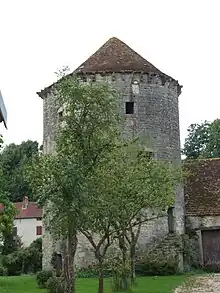 Simon de Torcenay was abbot from 1423 until his death in 1444. He repaired the buildings and strengthened the fortifications.[13] In 1425 he built the first forges on the Bèze. He was a "warrior monk" and fortified the abbey with walls surrounded by a moat and accessed over a drawbridge He built a second line of walls to fortify the village.[9] Around 1428 Claus de Werve made a polychromed limestone statue of the Virgin and Child for the abbey, which was installed in the Church of Saint-Martin at Bézouotte and has survived. Construction of the fortified enclosure began in 1429. The Chaux tower in the south and the Oysel tower in the north still stand, and carry the arms of Simon de Torcenay.[50] In 1433 there was a risk of rebellion by the lords of Château-Vilain, Grancey and Vergy against the Duke of Burgundy. On 10 May 1433 the duke addressed letters patent to the monks and people of Bèze telling them to remain faithful to the king of France and refuse entry to any stranger or enemy. That year he invited the abbot Simon de Torcenay, his councilor and chamberlain, to attend a solemn ceremony of a chapter of the Order of the Golden Fleece.[51]