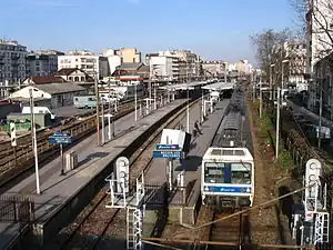 Bécon-les-Bruyères is a railway station in the town Courbevoie, Hauts-de-Seine department, in the northwestern suburbs of Paris, France. It is on the railway lines from Gare Saint-Lazare to Versailles and to Saint-Germain-en-Laye, and is served by Transilien Line L.