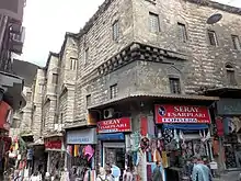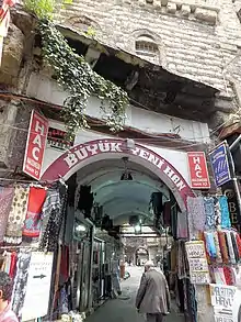 The han' is located in the central historic market district that extends from the Grand Bazaar to the Eminönü neighbourhood on the shore of the Golden Horn.[1] Since the founding of the first bedesten by Mehmet II in the mid-15th century, the Grand Bazaar developed into the city's main hub of international trade, spawning entire districts of shops, warehouses, and merchant lodgings.[2][3] A han, a type of urban caravanserai, was a common type of commercial structure in Ottoman architecture (and more broadly in Islamic-world architecture) which served a number of functions including lodging for foreign merchants, storage for goods or merchandise, housing for artisan workshops, and offices from which to conduct dealings.[2] A number of hans were built over the centuries in and around the Grand Bazaar district.[1] The Büyük Yeni Han was completed in 1763 or 1764 CE (1177 AH) on the orders of Sultan Mustafa III.[1][4][5] Records show that the land for the new building was procured in 1761 partly through a series of property exchanges negotiated with the existing waqfs (official foundations established through Islamic endowments) and other properties on the site. For example, one piece of the land, a plot of around 523 square meters belonging to the waqf of Çavuşbaşı Ali Agha, was obtained in exchange for various other properties throughout Istanbul in an agreement dated to August 2-11, 1761.[5] Another plot of land occupied by a house, covering around 402 square meters, was obtained in exchange for an estate house in the Edirnekapı area of the city, as part of an agreement dated to September 1-10 of the same year.[5] The records suggest that construction thus started in late 1761, right after these (and other) agreements were concluded.[5] Although the chief architect of the project has not been identified, the building supervisor is named in multiple documents as Şehremini Haşim Ali Bey. Some scholars believe that around this period the role of "chief architect" had decreased in importance by comparison with the construction supervisor, which suggests that Şehremini Haşim Ali Bey may have practically played a very important role in the building's design and execution.[5] The building's completion date of 1177 AH (1763-1764 CE) is based on an inscription on its northeast corner and on the date of the waqf agreement written to govern it.[5]