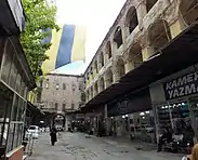 Inside, the han has three floors arranged around a very long, almost rectangular courtyard. Around the whole courtyard runs a three-level gallery of arches which gives access to the various rooms across each floor. The courtyard is interrupted at around its mid-length, however, by a plain stone structure added later in the 19th century which now divides the courtyard into two, bridging the two sides of the gallery. This later division reduces the impression of the building's original grandeur.[1][6] At one point the building had over 150 rooms for shops and offices, not counting various service rooms and the row of shops additionally located on its exterior western side along the street.[6] (The exact number of rooms varies depending on the sources consulted, with Ahmet Yaşar suggesting the original number of rooms must have been 164.[5]) The ceilings of some rooms have preserved remains of painted decoration which was characteristic of the Ottoman Baroque period, influenced by European art and illustrating small scenes of landscapes and buildings.[5]