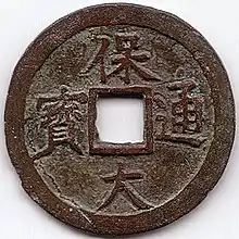 - ↑ François Thierry de Crussol (蒂埃里) (14 September 2015). "Sapèques frappées de Bảo Đại 保大 - Struck cash coins of Bảo Đại - Bảo Đại thông bảo 保大通寳, «monnaie courante de [l'ère] Bảo Đại». Cuivre, Ø 18,3, 1,39 g. - La frappe des Bảo Đại thông bảo 保大通寳" (in French). TransAsiart. Retrieved 24 April 2020.