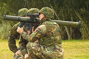 The Shoulder-launched Multipurpose Assault Weapon (SMAW) is a shoulder-launched rocket weapon, designed by McDonnell Douglas, with the primary function of being a portable anti-armor rocket launcher. It entered service in the U.S. Marine Corps in 1984. It has a maximum range of 500 m against a tank-sized target.
