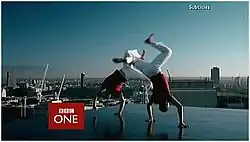 | Tumbler | 4 January 2005 – 7 October 2006 | Replaced Haka. First broadcast on 4 January 2005, the ident features five people (all with some red on their clothes) breakdancing on a walkway. It had to be relaunched after 24 hours, apparently due to a copyright dispute over the background music. BBC One Scotland continued to use the original version until the rebranding in 2006. The jingle is upbeat and features synthesised brass. It was filmed on location at the now-demolished BBC Birmingham Pebble Mill Studios, and was the final 'Rhythm & Movement' ident to be added to its regular playlist. |