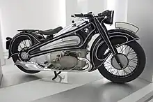 The BMW R7 was conceived in 1933 by engineer and designer Alfred Böning, with an Art Deco mathematical geometric basis of his design.[6] Only one R7 was ever made, which Böning disassembled and stuck away with design plans in a BMW warehouse. It was discovered more than seventy years later, in 2005. Hans Keckeisen in Munich began a restoration on behalf of the BMW Museum, completed 2012.[7] After appearing in European bike shows, restored 1934 R7 was first shown in the US at the Pebble Beach Concours d'Elegance.
