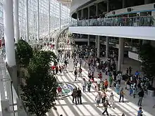 The arena encompasses 565,000 square feet (52,500 m2) and reaches a maximum height of 134 feet (41 m). Inside, the bowl area's ceiling rises 120 feet (37 m) over the base floor and a 930-foot (280 m)-long HD ribbon screen wraps around the three-level seating area. There are 17,343 fixed seats, each ranging from 20 inches (51 cm) to 22 inches (56 cm) wide—an average width greater than the industry standard, including that of Paycom Center in Oklahoma City.[1] Actual capacity fluctuates with configuration patterns, and total seating can vary from 13,644 to 19,199—13,644 for partial-use concerts, 16,582 for arena football, 17,096 for hockey, 17,839 for basketball, and 19,199 for center stage concerts.[2] The bowl area's second floor, an exclusive carpeted level with a complete bar, houses press areas and 37 luxury suites, each with 15 22-inch (56 cm) seats and furnished gathering and kitchen areas. In the main concourse, more than 130,000 square feet (12,000 m2) of terrazzo flooring has aggregate that contains 70% mother of pearl.[1] Private funding exceeded original forecasts, and unexpected increases in revenue from corporate sponsorships, donations, and purchases of box seats and luxury boxes paid for an advanced light display for the glass wall that wraps around the front of the building and the scoreboard.[18]
