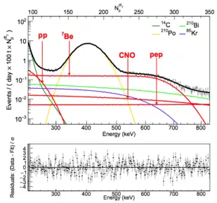 - ↑ Borexino Collaboration; Agostini, M.; Altenmüller, K.; Appel, S.; Atroshchenko, V.; Bagdasarian, Z.; Basilico, D.; Bellini, G.; Benziger, J.; Bonfini, G.; Bravo, D. (2019-10-28). "Simultaneous precision spectroscopy of pp, 7Be, and pep solar neutrinos with Borexino Phase-II". Physical Review D. 100 (8): 082004. arXiv:1707.09279. Bibcode:2019PhRvD.100h2004A. doi:10.1103/PhysRevD.100.082004.