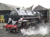Like the "Clan" class locomotives, Standard 5s, with their high-stepped running board, were partly conceived to be more economical and serviceable replacements for the Bulleid Pacific, and the Standard Class 5 were fast, they could really fly with good steam, easily to just under 100mph in the view of many engine drivers. Like the Clans, which could only manage one more carriage on an express than a 'Five' the Standard Fives took a long time to shake down, and only started to really pull when different firing techniques, which allowed them to steam using poor quality coal were developed.[3] They pulled much of the traffic on the last express lines for steam in the mid and late 1960s: Edinburgh-Aberdeen, London- Southampton-Bournemouth- Weymouth and local express traffic in the North and Midlands around Sheffield and Leeds. They were also used on the locals between Liverpool, Manchester and Blackpool, some steam hauled to the last day of steam in 1968.