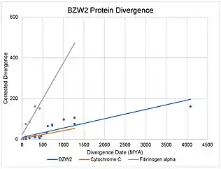 Compared to Cytochrome C, a quickly diverging protein, and Fibrinogen, a slowly diverging protein, BZW2 has had slow corrected divergence over time, illustrating conservation and protein importance.