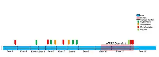 The coded protein is 419 amino acids long and weighs 48.3 kDa.[8] As described in the name, the protein contains a leucine-zipper motif. Four “L……” repeats are present in the beginning, giving rise to the characteristic leucine zipper helix within the 3D structure. An eIF5C domain follows the leucine motif, which is a part of proteins that are important for strict regulation of cellular processes.[9]