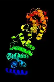 The secondary structure contains a majority of alpha helices.[11] There are 19 alpha helices in all orthologs, except for two additional beta sheets which are absent in humans. The tertiary structure forms a repeated fold of alpha-helices, a structure that is conserved through bacteria.