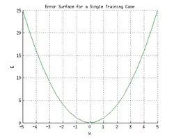 Consider the network on a single training case: . Thus, the input and are 1 and 1 respectively and the correct output, t is 0. Now if the relation is plotted between the network's output y on the horizontal axis and the error E on the vertical axis, the result is a parabola. The minimum of the parabola corresponds to the output y which minimizes the error E. For a single training case, the minimum also touches the horizontal axis, which means the error will be zero and the network can produce an output y that exactly matches the target output t. Therefore, the problem of mapping inputs to outputs can be reduced to an optimization problem of finding a function that will produce the minimal error.
