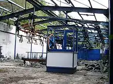 Service on the gondola lift was abandoned in 1981, when some residents denied the right to let their estates be crossed. The owner acquired new easements in 1999, theoretically allowing for the cable car to run again. However, the summit station and a large number of cabins burnt out in a 2000 arson attack. As a result of the arson, the pillars were removed in 2005.
