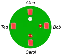 Compulsory bets: Alice is the dealer. Bob, to Alice's left, posts a small blind of $1, and Carol posts a big blind of $2.