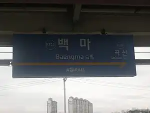 Baengma Station is a railway station on the Gyeongui–Jungang Line. It is located in Madu-dong, Ilsan, the city of Goyang.