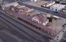 In 1889, the current railroad station was constructed. The station was originally built in the Richardsonian Romanesque style. It contained both a train station and a hotel. One of the station's most defining features was the long arcade, that stretched along the entire north side, connecting the station and the hotel.[3] That same year, the Bakersfield and Kern Electric Railway moved its main line (called the Santa Fe and Southern Pacific Line) to the Santa Fe Bakersfield Station.[2]