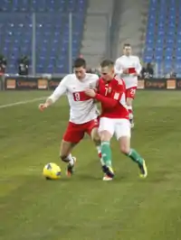 Dzsudzsák made his Hungary debut on 2 June 2007 in Heraklion against Greece. His first international goal came on 24 May 2008, incidentally in a match against Greece again.[52] His fourth goal was a 94th-minute winner against Finland on 12 October 2010.[53][54] Dzsudzsák scored his fifth goal against Lithuania in a friendly match in the Stadion Sóstói. He has scored three of his goals in the final three games in 2010, two of which were UEFA Euro qualifiers. Dzsudzsák scored the third goal of the four goals against Iceland at the Puskás Ferenc Stadium. The match finished 4–0.[55] On 10 September 2013, Dzsudzsák scored his a goal wearing the national team's shirt in a 5–1 victory over Estonia in the 2014 FIFA World Cup qualification match at the Puskás Ferenc Stadium.[56][57][58]