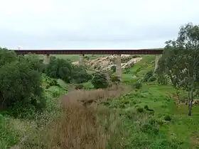 The earliest part of the narrow gauge Hamley Bridge-Gladstone line opened from Balaklava to Blyth on 14 March 1876 as part of the Port Wakefield line. On 15 January 1880, the line opened from Hamley Bridge to Balaklava.[2] It was extended north from Blyth to Gladstone on 2 July 1894 where it joined the Port Pirie-Cockburn and Wilmington lines. The line was gauge converted to 5 ft 3 in (1,600 mm) on 1 August 1927. The line from Gulnare to Gladstone closed on 11 May 1988, followed by the Balaklava to Gulnare section on 29 March 1989.[3] The section track between Balaklava and Gladstone was removed in late 1989, and the 10 km section between Halbury and Balaklava has now been converted into the Shamus Liptrot Cycling Trail.[4]