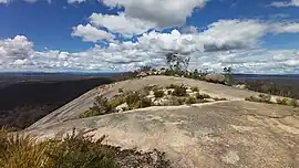 The park is named after its most prominent feature, Bald Rock, which is a large granite outcrop rising 260 metres above the surrounding landscape and almost 1300 metres above sea level.[2] Measuring about 750 metres long and 500 metres wide this is the largest granite monolith in Australia.[3][4] Access to the rock is provided by a sealed road into the park and walking tracks to the summit. Two tracks are marked, a steep one up the exposed face, or an easier gradient through bushland around the back. The Bungoona Walking Track, built in 1980, goes more gently up the eastern side of Bald Rock and winds through forest. It passes through some granite boulder formations, including an arch, covered in mosses, ferns and orchids. The summit offers panoramic views of the surrounding bushland, but vegetation on top prevents a full 360° view. The views are so expansive, mountains as far north as the Queensland/New South Wales border can be seen, such as Mount Barney, Mount Lindesay and Flinders Peak, and as far south as Mount MacKenzie, south of Tenterfield.