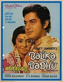 Balika Badhu (Hindi: बालिका बधू; translation: Child Bride) is a 1976 Hindi romantic comedy-drama film produced by Shakti Samanta and directed by Tarun Majumdar.[1] The film is based on the Bengali novel by the same name by Bimal Kar, about a young girl who is married before she is old enough to understand what marriage is all about, against the backdrop of Indian freedom struggle. Gradually she and her school-going husband grow as a couple and begin to love one another. The film was previously made into a Bengali film, Balika Badhu (1967), starring Moushumi Chatterjee, by Tarun Majumdar himself.[2]