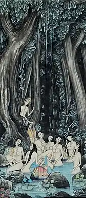 Among the early Batuan artists, I Ngendon (1903-1946) was considered the most innovative Batuan School painter.[6] Ngendon was not only a good painter, but a shrewd business man and political activist. He encouraged and mobilized his neighbours and friends to paint for tourist consumption. His ability in portraiture played an important role in teaching his fellow villagers in Batuan more than Spies and Bonnet.[6] The major Batuan artists from this period were: I Patera (1900-1935), I Tombos (b. 1917), Ida Bagus Togog (1913-1989), Ida Bagus Made Jatasura (1917-1946), Ida Bagus Ketut Diding (1914-1990), I Made Djata (1920-2001), and Ida Bagus Widja (1912-1992). The spirit of the Pitamaha period is still strong and continues by contemporary Batuan Artists such as I Made Budi, I Wayan Bendi (b. 1950), I Ketut Murtika (b. 1952), I Made Sujendra (b. 1964), and many others. I Made Budi and I Wayan Bendi paintings capture the influence of tourism in modern life in Bali. They place tourists with their camera, riding a motorbike or surfing in the midst of Balinese traditional village activities. The dichotomy of modern and traditional Balinese life are contrasted starkly in harmony. I Ketut Murtika ( still paints the traditional story of Mahabharata and Ramayana in a painstaking details with subdued colors. His painting of the Wheel of Life viewed from the Balinese beliefs system shows his mastery of local legends and painstaking attention to details.[9]